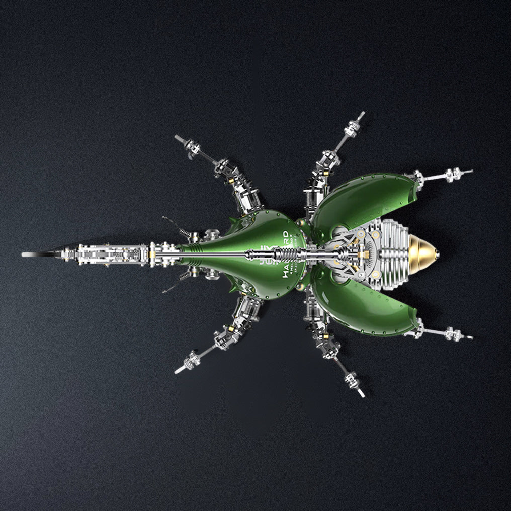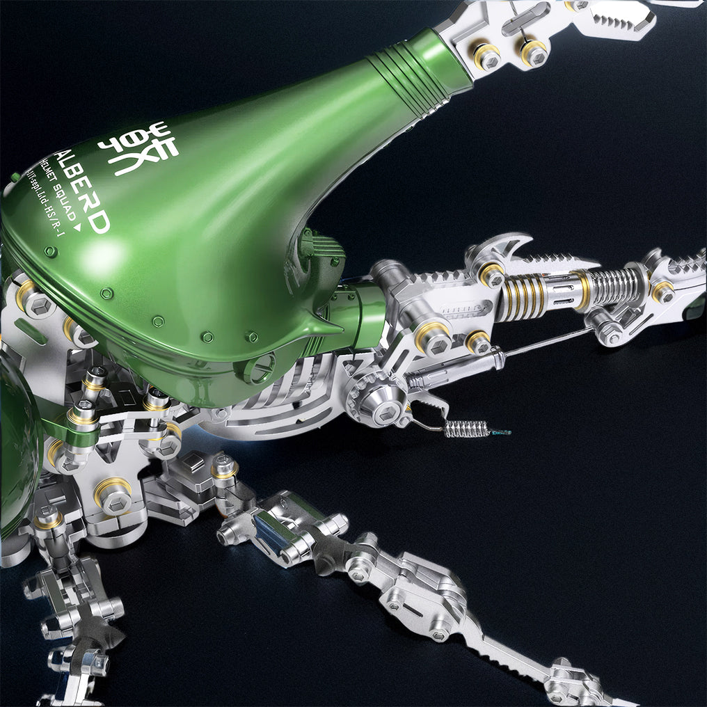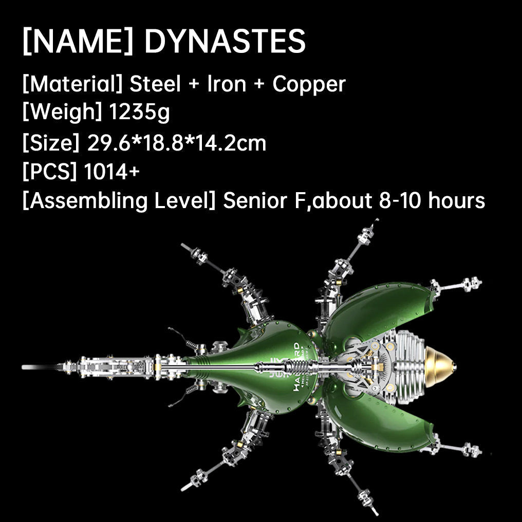 This kit includes all the necessary materials such as food-grade stainless steel, aluminum, and copper that are precisely cut to ensure safety during assembly. The brushed metal provides a pleasant tactile experience and offers both durability and aesthetic appeal, setting it apart from traditional plastic or wooden models. These high-quality materials come in environmentally friendly packaging and are suitable for adults and children over 10 years old. The mechanical core includes striking details such as the hydraulic jaw, abdominal components, openable wings, and hydraulic leg connections, making this Mechanical Dynastes resemble a fantastical creature from a retro world.