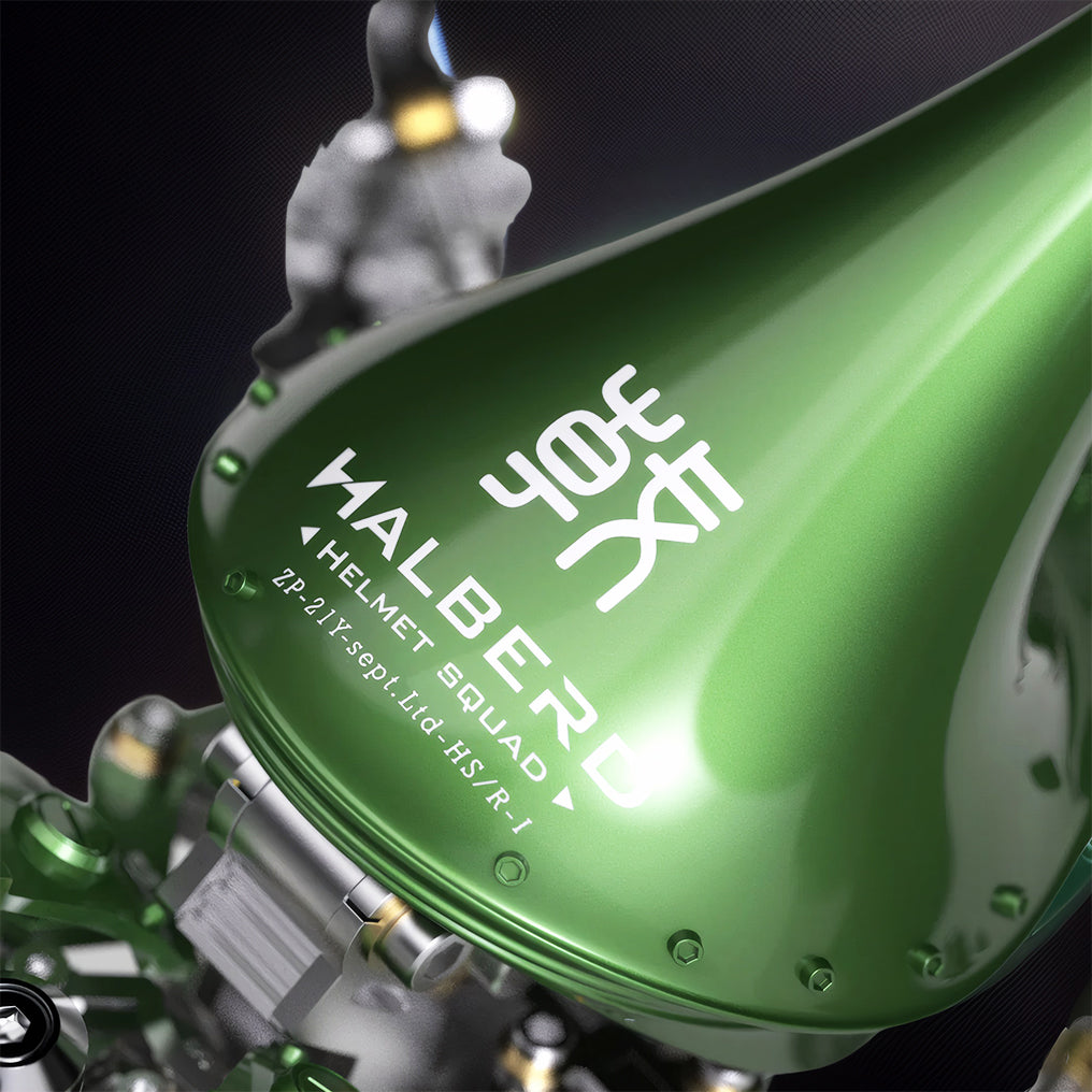 The "戟" inscribed on its head symbolizes the "HALBERD," a formidable weapon that combines the features of a spear and an ax used in ancient China. The robust horn structures resemble the headgear worn by warriors, giving the beetle its nickname "HELMET SQUAD." The serial number located on the underside allows for easy identification of each dynasty represented by this model.